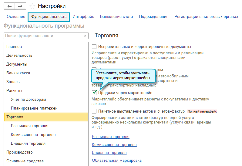Полный интерфейс: меню "Главное - Настройки - Функциональность - Торговля".