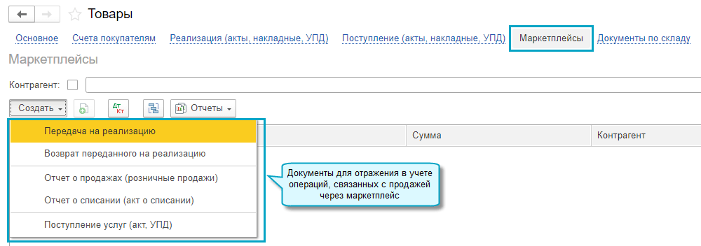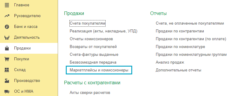 В полном интерфейсе документы для отражения в учете операций, связанных с продажей товаров через маркетплейсы и комиссионеров, также собраны в специальном разделе: