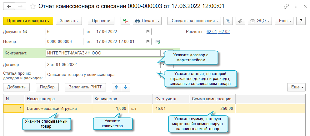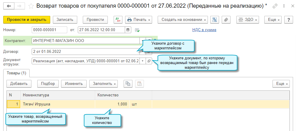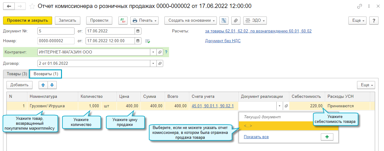 Используйте документ Отчет комиссионера о розничных продажах для отражения в учете розничных продаж через маркетплейс и возврата товара покупателем.