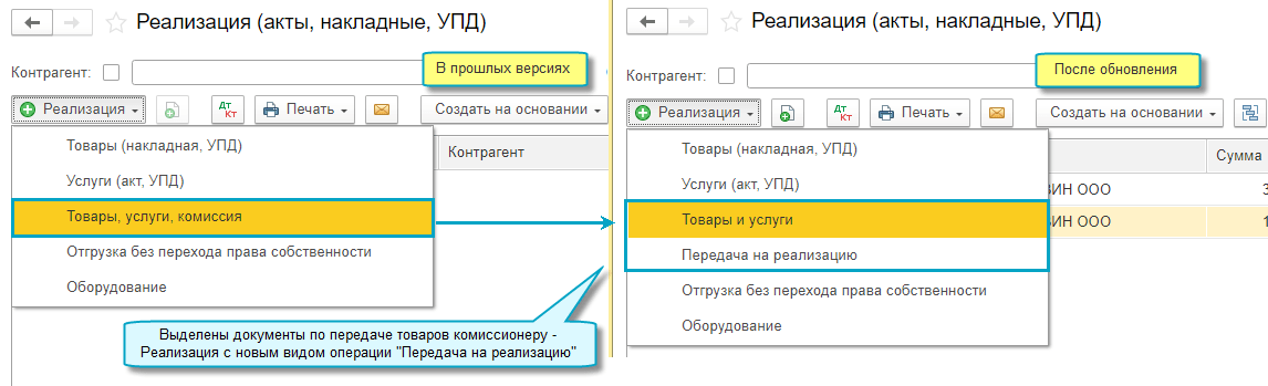 Полный интерфейс: меню "Продажи - Продажи - Маркетплейсы и комиссионеры - Передача на реализацию".