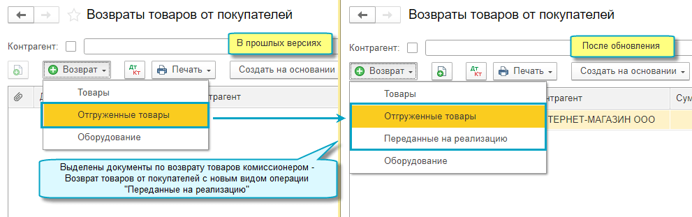 Полный интерфейс: меню "Продажи - Продажи - Маркетплейсы и комиссионеры - Возврат переданного на реализацию".