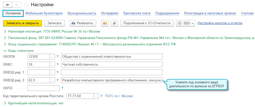 Полный интерфейс: меню "Главное - Настройки - Организации".