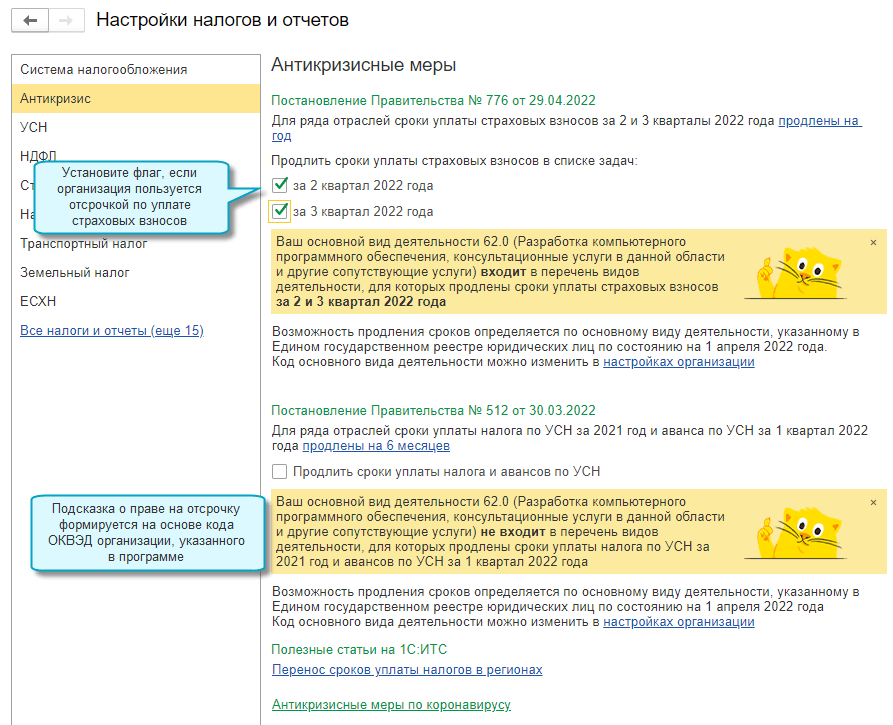 В облачных версиях сроки представления отчетов и уплаты налогов актуализируются автоматически по мере обновления классификатора.