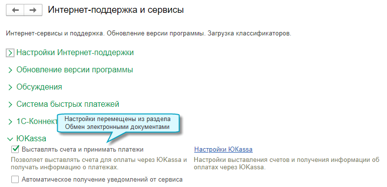 Настройки интеграции с ЮKassa перемещены в раздел Интернет-поддержка и сервисы.