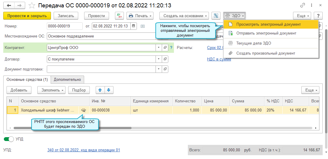 Добавлена возможность при передаче основных средств отправить по ЭДО универсальный передаточный документ (УПД).
