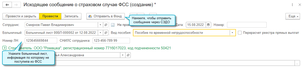 Документ Исходящее сообщение о страховом случае можно создать также на основании Больничного листа.
