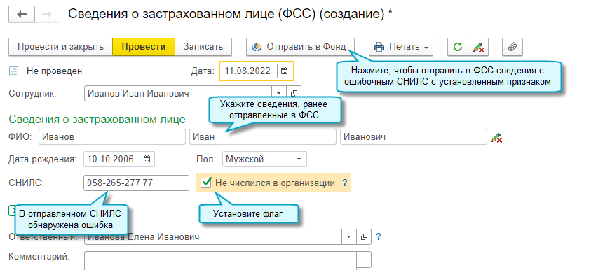 Затем отправьте в ФСС сведения о застрахованном лице с правильным СНИЛС.