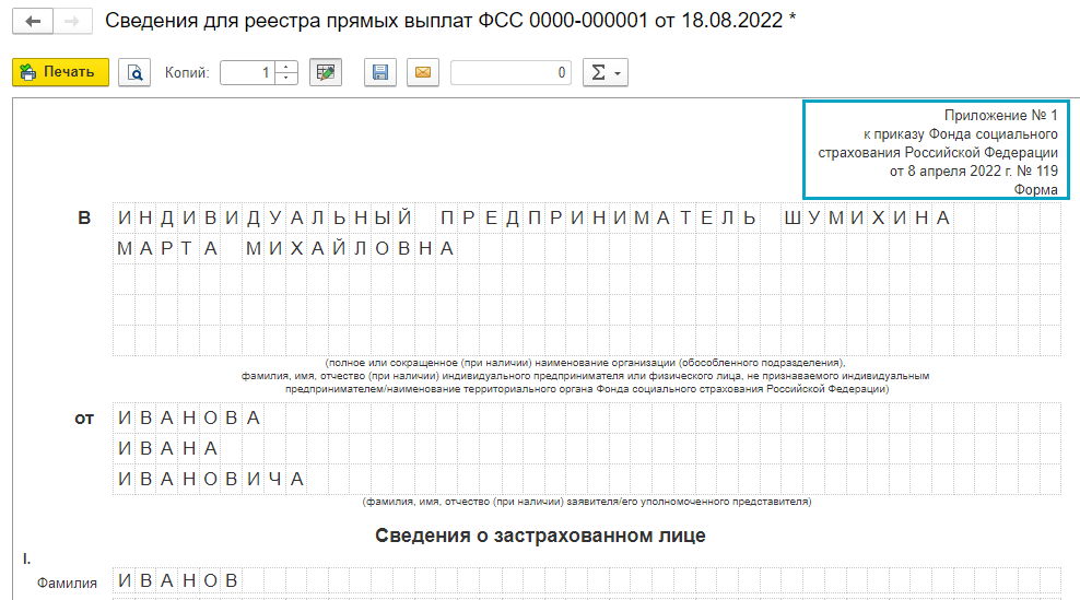 В сведения для реестров прямых выплат ФСС добавлена печатная форма Сведений о застрахованном лице, действующая с 31.05.2022 (Приказ ФСС РФ от 08.04.2022 № 119).