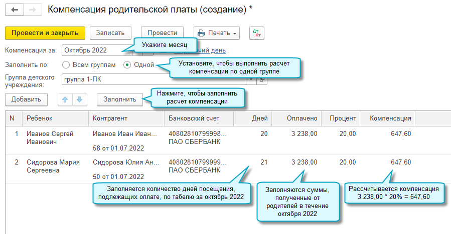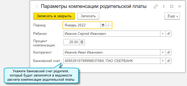 Расчет компенсации родительской платы за уход и присмотр за детьми теперь выполняется в документе Компенсация родительской платы. В прошлых версиях был доступен только отчет Ведомость расчета компенсации родительской платы и расчет компенсации не сохранялся.