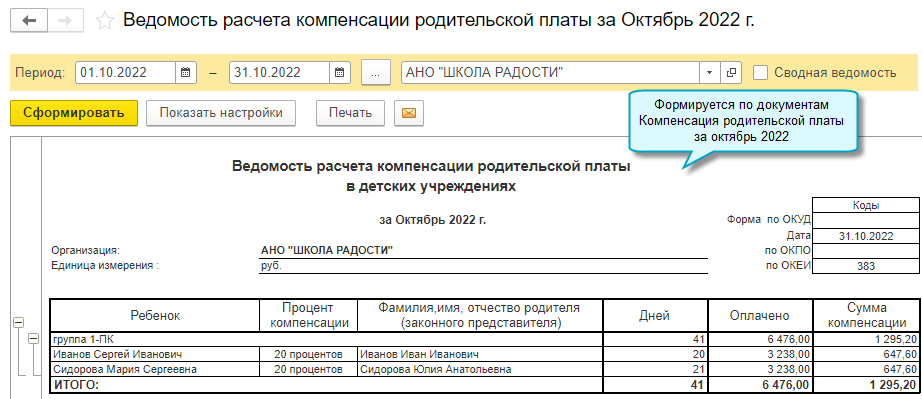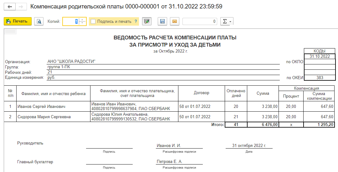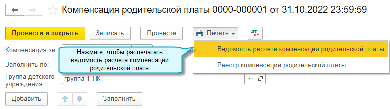 Для документа Компенсация родительской платы добавлена также печатная форма Реестр компенсации родительской платы.