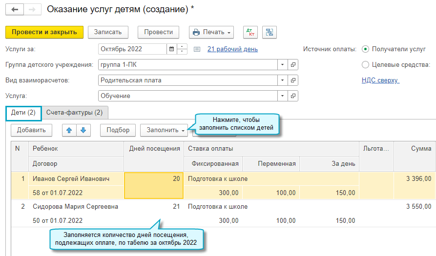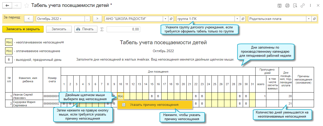 Добавлена возможность вести учет посещаемости детей. Табель учета посещаемости детей используется при расчете суммы оказанных услуг.