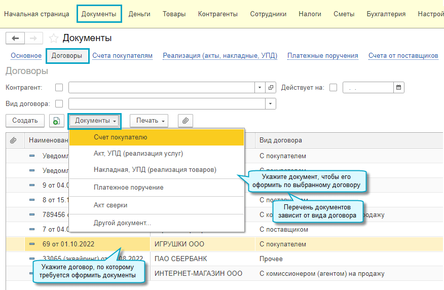 Простой интерфейс: меню "Документы - Договоры".