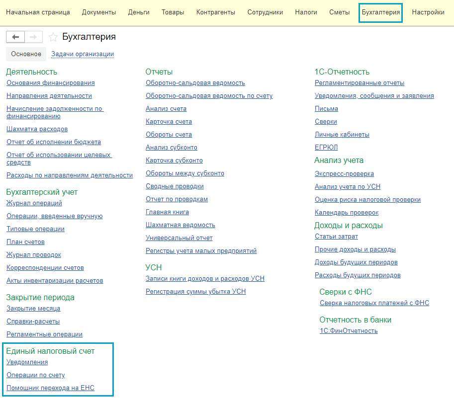 Простой интерфейс: меню "Бухгалтерия - Единый налоговый счет".