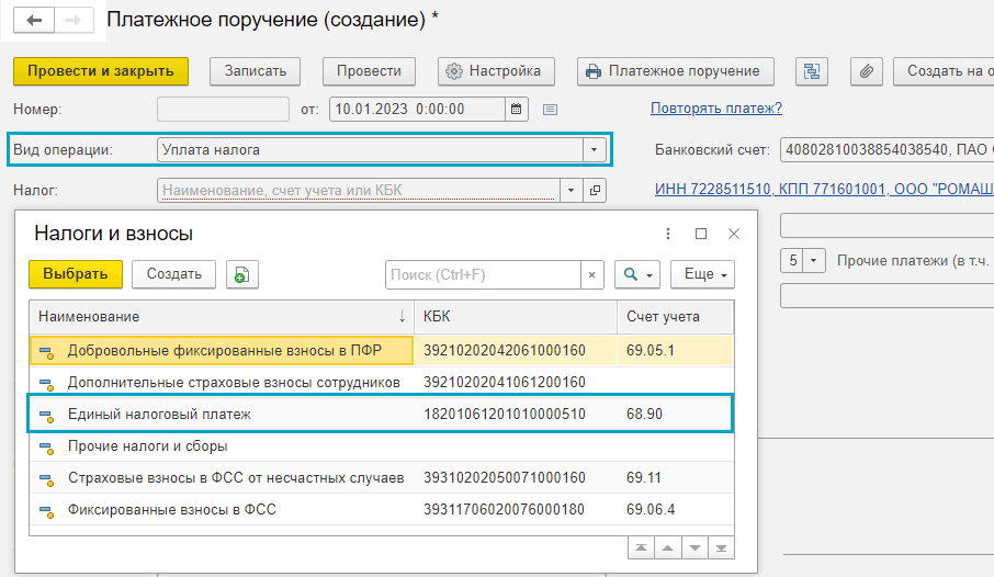 Добавлена возможность автоматического ввода начального остатка на едином налоговом счете. Остатки задолженности и переплаты по налогам и взносам на 31.12.2022 списываются на счет 68.90 "Единый налоговый счет".