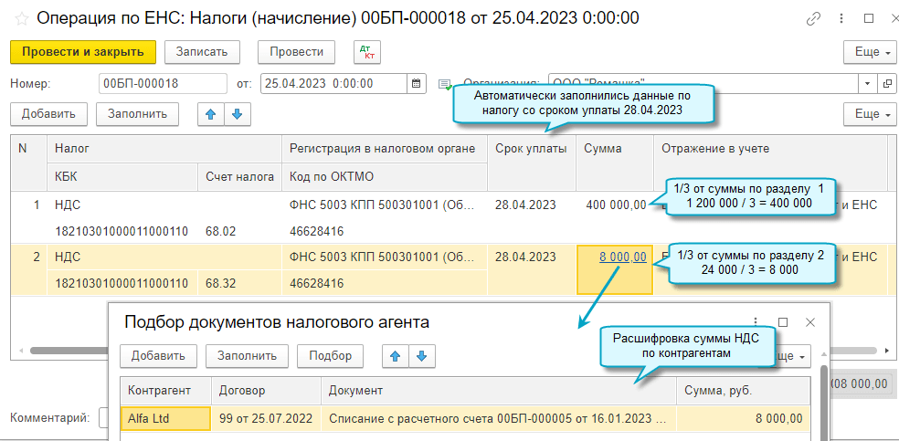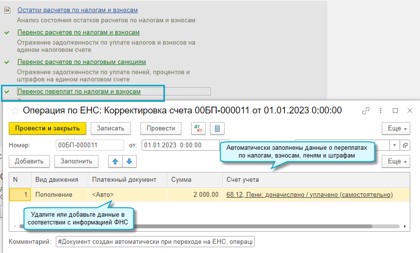 Добавлена возможность корректировать автоматический зачет ЕНП на уплату налогов и взносов, отражать в учете другие операции на едином налоговом счете без подачи уведомлений по исчисленным суммам налогов.