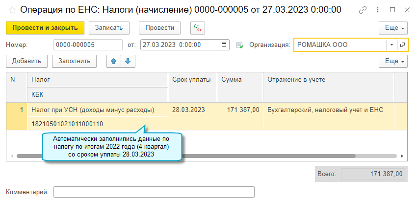 Остаток по счету 68.90 "Единый налоговый счет" должен соответствовать сальдо ЕНС по данным ФНС. Может потребоваться ручная корректировка сумм, заполненных автоматически.