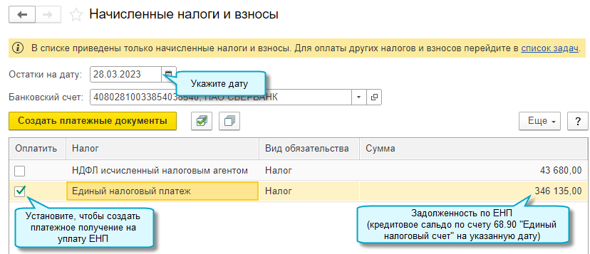 Добавлена возможность формировать платежные поручения по уплату единого налогового платежа (ЕНП) по мере наступления сроков уплаты налогов и страховых взносов.