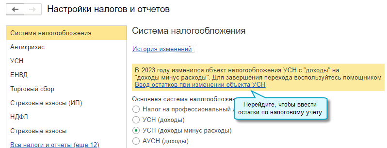 Добавлена возможность автоматического ввода остатков налогового учета по УСН при смене объекта налогообложения.