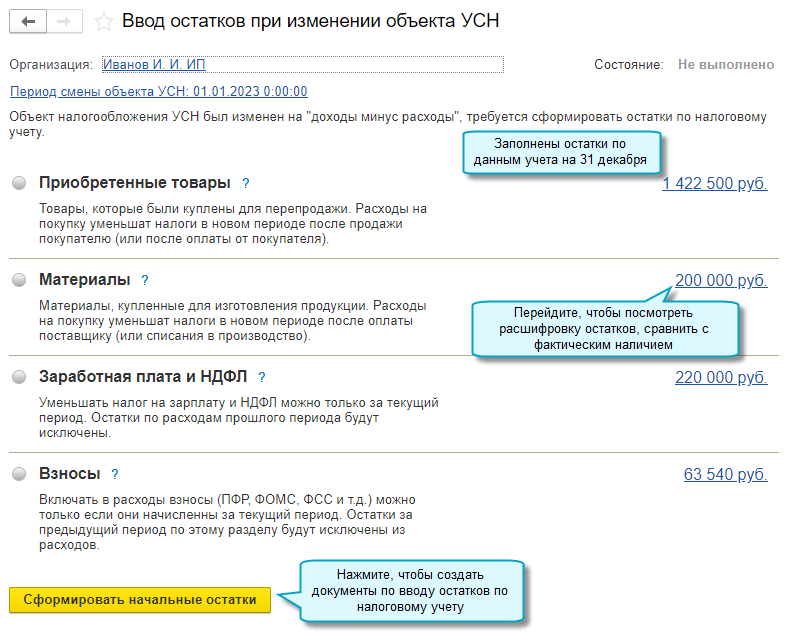 Аналогично выполняется ввод остатков при переходе с УСН "доходы минус расходы" на УСН "доходы".