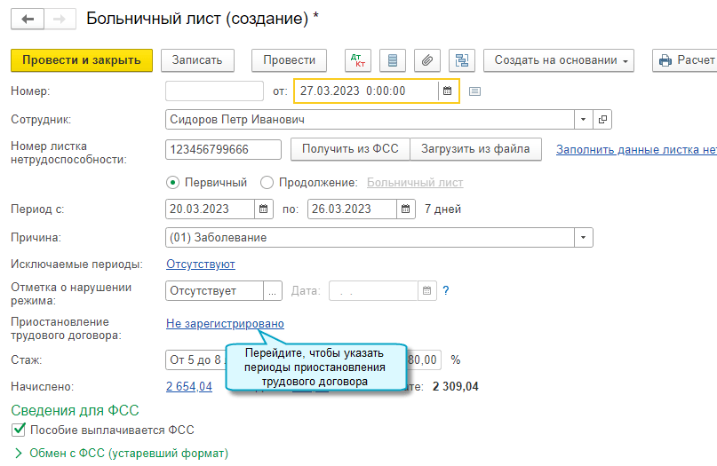 Информация о приостановлении трудового договора из Больничного листа переносится в Ответ на запрос ФСС для расчета пособий, созданный на его основании.