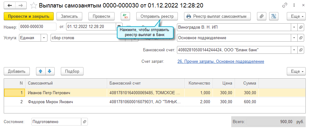 Подробнее о выплатах самозанятым через сервис 1С:DirectBank см. в Статье.