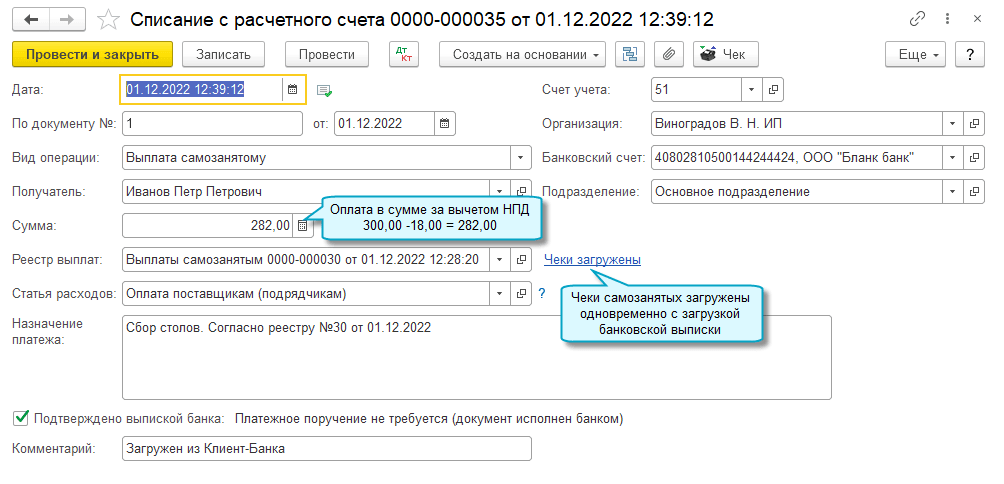 По каждому самозанятому загружается два документа Списание с расчетного счета, если самозанятый уполномочил банк уплачивать налог на профессиональный доход (НПД) со своих доходов.