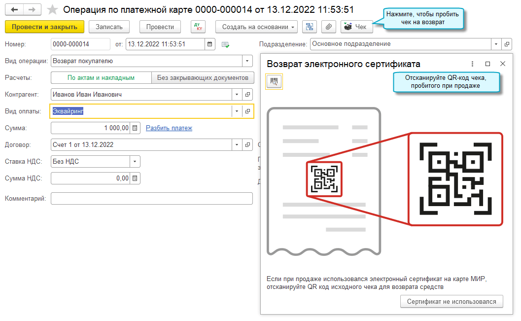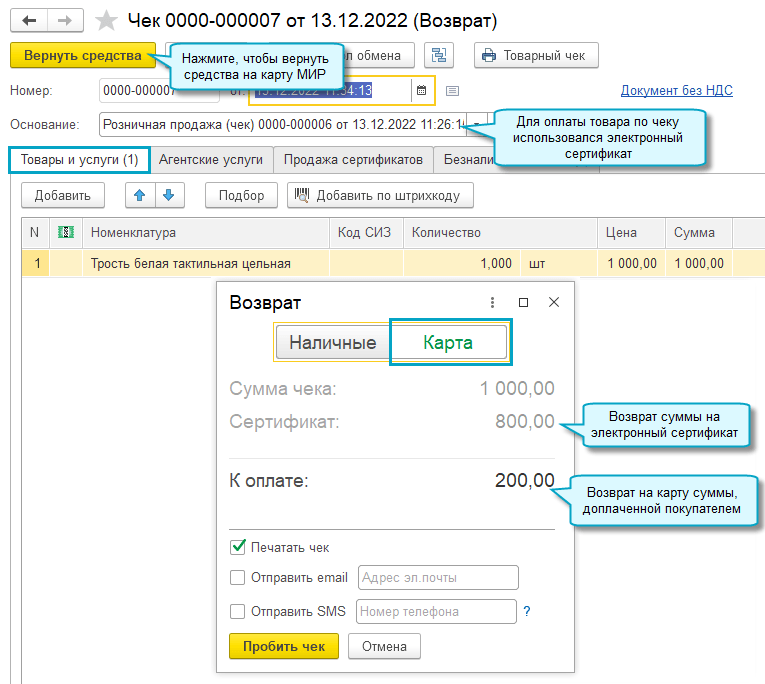 Добавлена возможность вернуть сумму покупки на электронный сертификат в случае возврата товара.