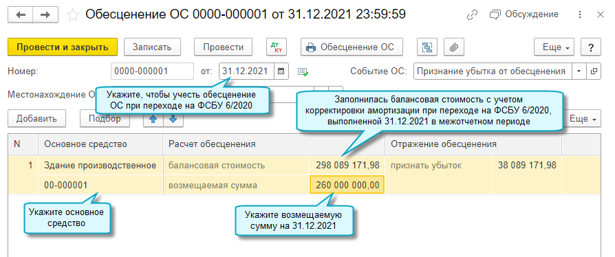 Добавлена возможность учесть накопленное обесценение в единовременной корректировке стоимости основных средств при переходе на ФСБУ 6/2020 "Основные средства" (Рекомендация Бухгалтерского методологического центра Р-139/2022-КпР "Обесценение основных средств при переходе на ФСБУ 6/2020"). Для этого используется документ Обесценение ОС, который требуется провести 31.12.2021.