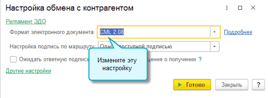 Простой интерфейс: меню "Настройки - Еще - Другие настройки - Обмен электронными документами - Настройки ЭДО - Настройки отправки документов".