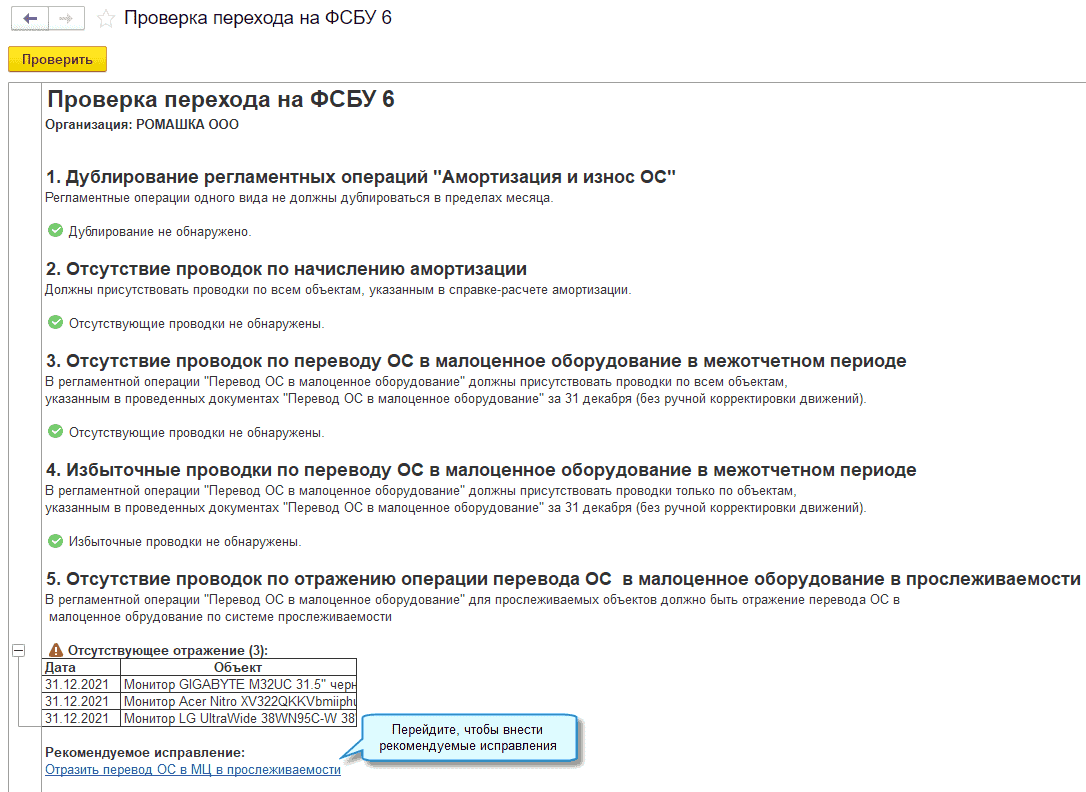 Добавлена возможность проверить отсутствие проводок по переводу основных средств в малоценное оборудование в прослеживаемости в межотчетный период. И автоматически устранить такие проблемы.