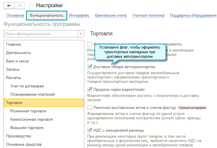 Полный интерфейс: меню "Главное - Настройки - Функциональность - Торговля".