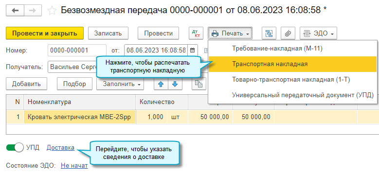 Добавлена возможность оформить транспортную и товарно-транспортную накладную при безвозмездной передаче товаров с доставкой до получателя.