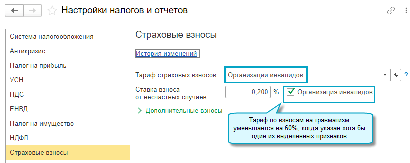 Полный интерфейс: меню "Главное - Настройки - Налоги и отчеты - Страховые взносы".