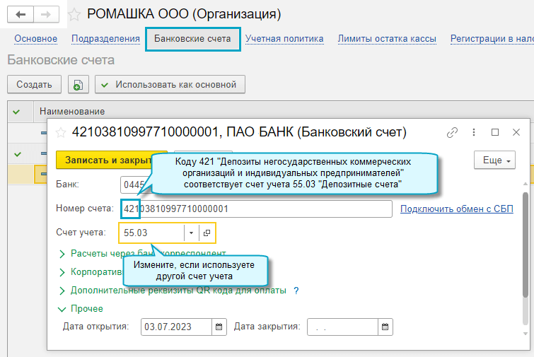 Для этого в карточки банковских счетов организации добавлен счет учета, на котором учитываются денежные средства. При обновлении он заполнится исходя из счета учета, указанного раньше вручную в документах Списание с расчетного счета, Поступление на расчетный счет, или самого номера банковского счета, если ещё не было операций по нему.