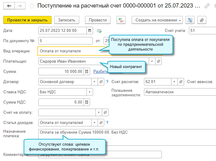Добавлен анализ назначения платежа для определения вида операции при загрузке банковской выписки. Теперь поступления от новых контрагентов загружаются как Целевое финансирование, только когда в назначении платежа есть на это указания, если нет - Оплата от покупателя. Это удобно для организаций, которые получают много платежей за платные услуги без оформления договора и выставления счета.