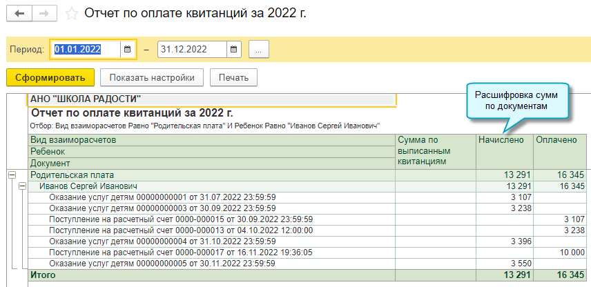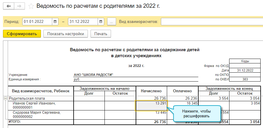 Полный интерфейс: меню "Деятельность - Отчеты - Ведомость по расчетам с родителями".