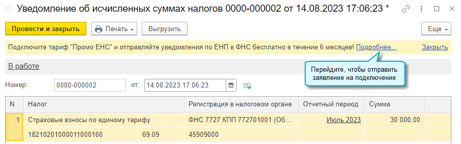 Добавлена возможность в течение 6 месяцев бесплатно отправлять в ФНС уведомления об исчисленных суммах налогов, запрашивать и получать справки о состоянии единого налогового счета. Для этого достаточно подключить специальный тариф "Промо ЕНС" сервиса 1С-Отчетности.