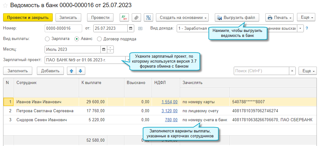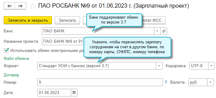 Добавлена возможность в рамках зарплатного проекта перечислять зарплату на счет сотрудника в другом банке, по его номеру карты, СНИЛС и номеру телефона. Чтобы воспользоваться, требуется перейти на версию 3.7 формата обмена с банками.
