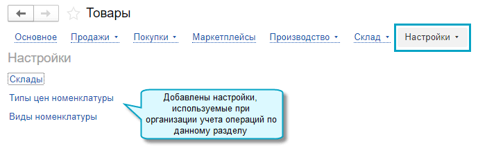 Настройки, связанные с организацией учета, теперь можно выполнить сразу в разделе, без перехода и их поиска в специальном разделе Настройки.