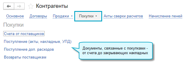 Полный интерфейс: меню "Покупки - Покупки - Поступление (акты, накладные, УПД)".