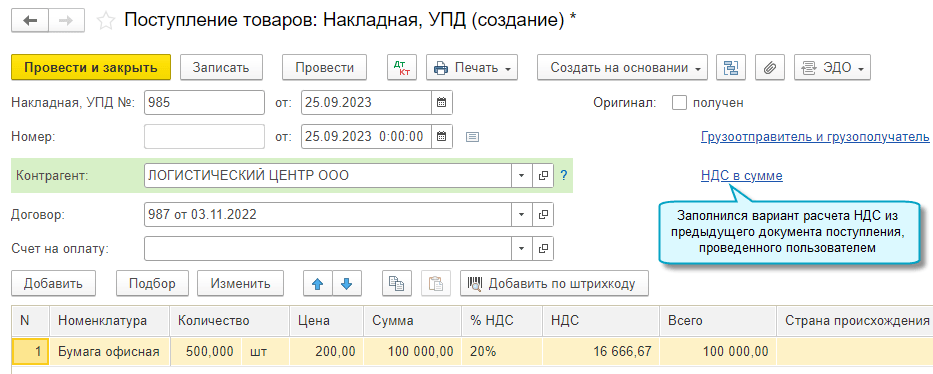 При проведении документов запоминаются указанные пользователем варианты расчета НДС - "НДС в сумме" или "НДС сверху", отдельно для покупок и продаж. И эти варианты автоматически заполняются при вводе последующих документов.