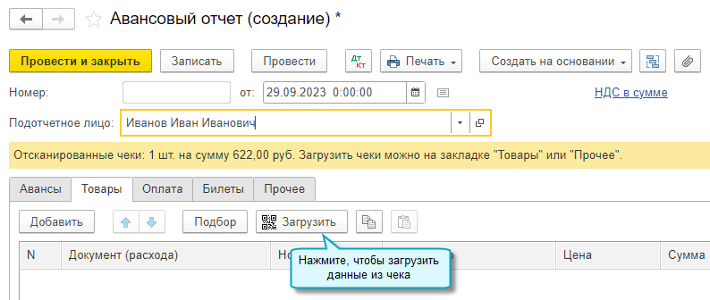 Добавлена возможность загружать кассовые чеки из файлов с их сканами или фотографиями. Данные распознанных чеков автоматически доступны для загрузки в Авансовый отчет и Путевой лист. Добавлена также возможность загружать данные из распознанных чеков вручную в эти и другие документы.