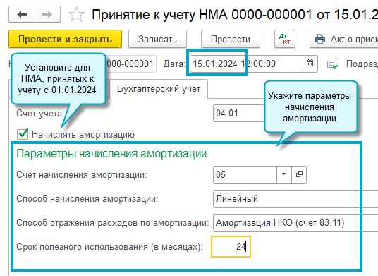 - установить сроки полезного использования для НМА, а также другие параметры амортизации, если это необходимо,