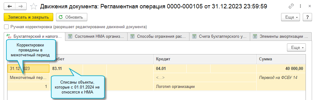 Проводки по единовременной корректировке стоимости НМА будут сделаны в межотчетном периоде регламентной операцией Переход на ФСБУ 14. Пересчет амортизации на 01.01.2024 из-за изменений элементов амортизации не выполняется, т.к. это не предусмотрено ФСБУ 14/2022.