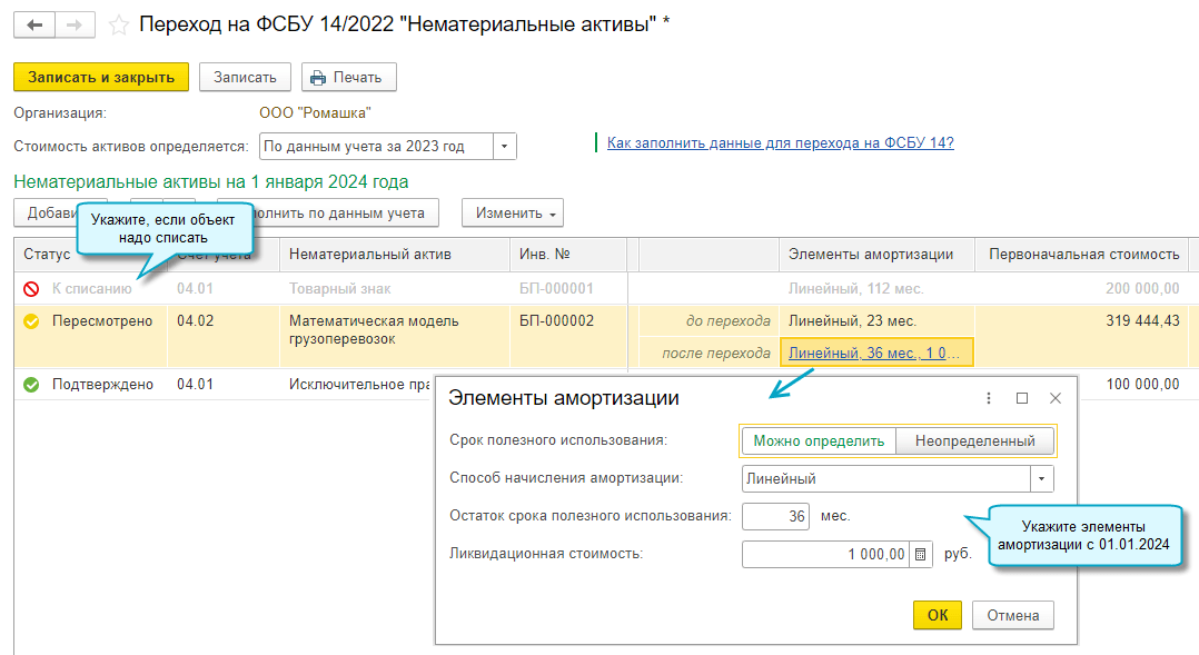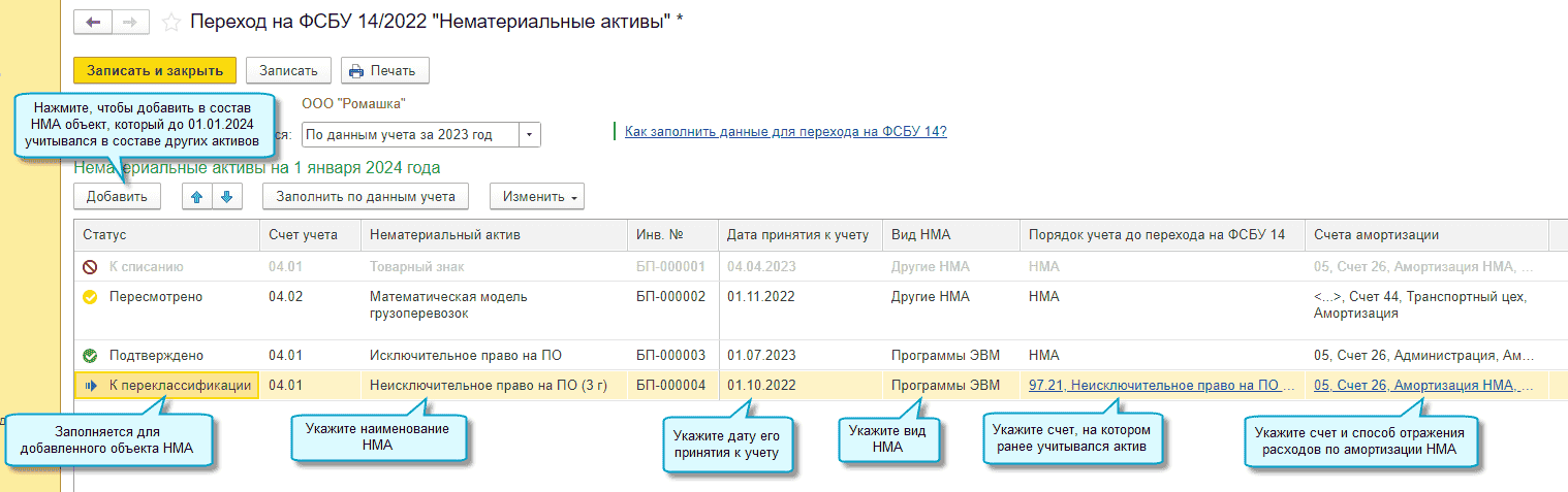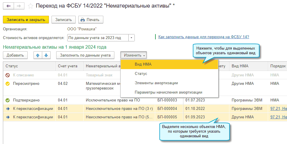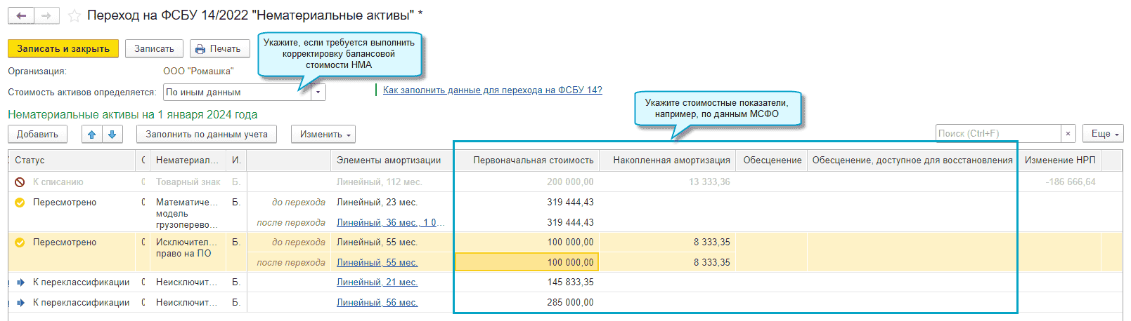 Добавлена возможность скорректировать балансовую стоимость НМА в соответствии с рекомендациями БМЦ Р-155/2023-КпР «Переход на ФСБУ 14/2022 "Нематериальные активы" и Р-145/2022-КпР «Использование данных МСФО при переходе на ФСБУ» , если это требуется. Данные по обесценению могут быть внесены сейчас, при этом потребуется заново выполнить регламентную операцию Переход на ФСБУ 14 после поддержки учета обесценения НМА в следующих версиях.