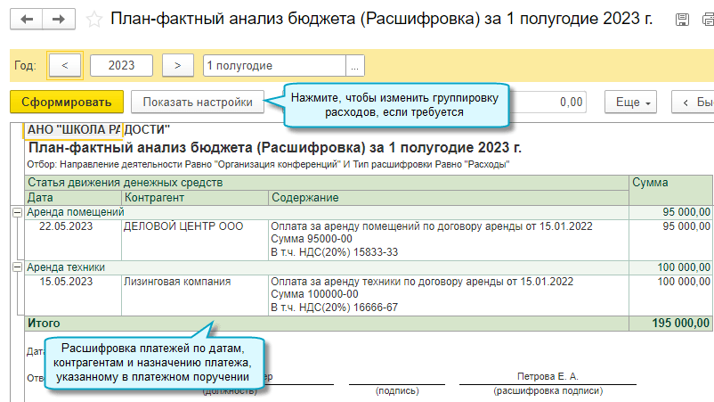 В расшифровке расходов теперь показывается когда, кому и за что заплатила организация.