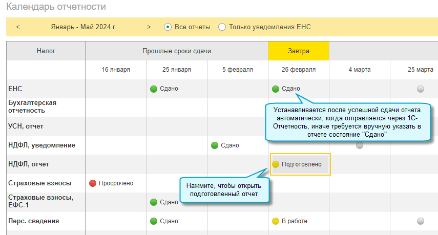 Добавлен календарь отчетности. Теперь можно проверить наличие и состояние всех отчетов, подготовить и отправить очередные по сроку сдачи.