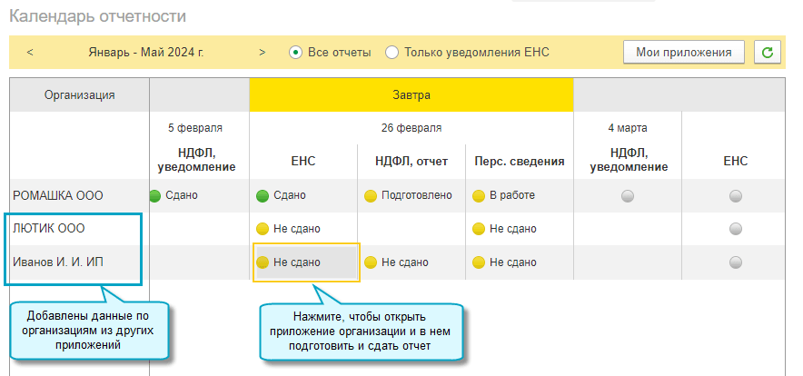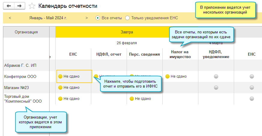 Календарь формируется по всем организациям, учет которых ведется в одном приложении.