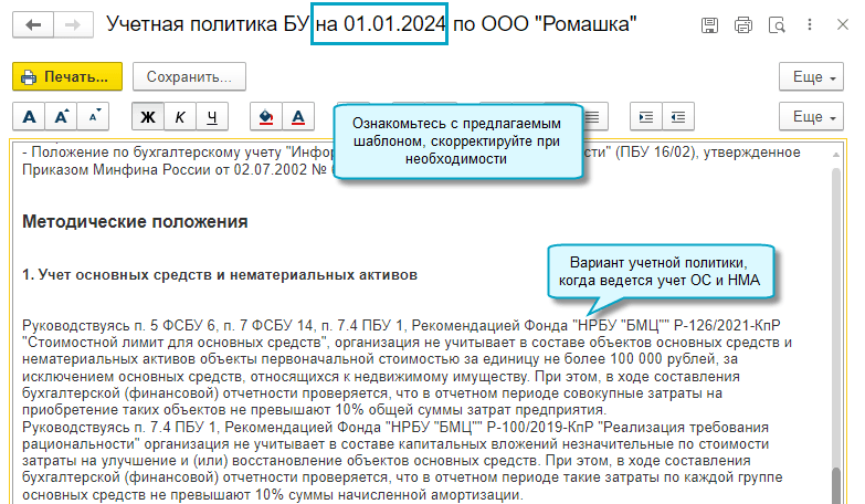 Шаблон учетной политики изменяется в зависимости от настроек функциональности и учетной политики по учету основных средств и нематериальных активов.