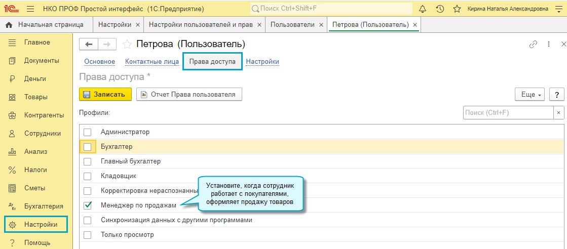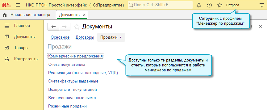 Добавлена возможность при использовании простого интерфейса ограничить права на работу с документами для сотрудников, которые работают с покупателями, оформляют продажу товаров. Для этого достаточно им назначить права профиля "Менеджер по продажам".